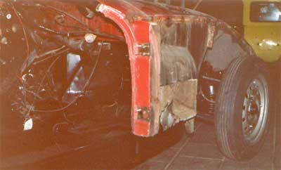De achterkant van de carrosserie kon in zijn geheel verwijderd worden. Hiervoor dienden eerst de binnenschermen losgemaakt te worden van de F-secties. Normaal gesproken zou dit zeer voorzichtig moeten gebeuren, als de F-secties opnieuw gebruikt gaan worden. In mijn geval moesten de F-secties toch vernieuwd worden en dus ik kon ze loshakken met een persluchtbeitel.
